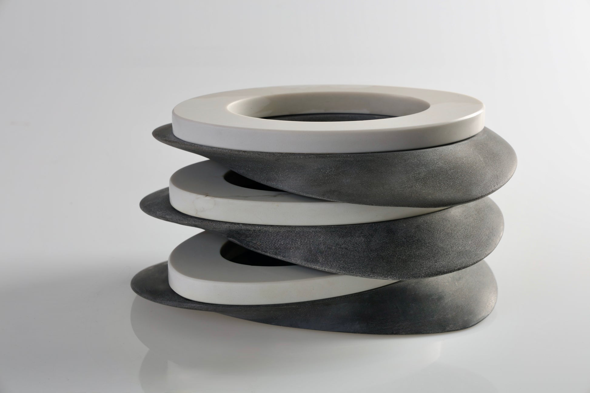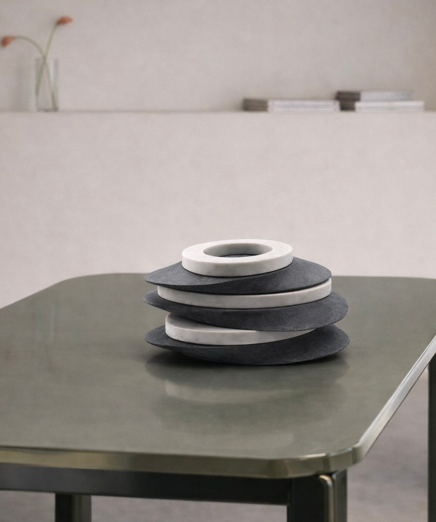 Al apilar tus FUSO, la pieza revela su propósito completo: una composición vertical que actúa como un gesto escultórico, una forma que emerge y dialoga con el entorno.